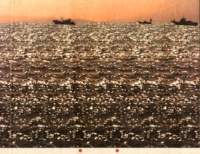 No.68作品 ヒント:朝焼けの海の中に見えるのは何でしょう? 剣のように上あごが伸びている魚です。「○○キ」